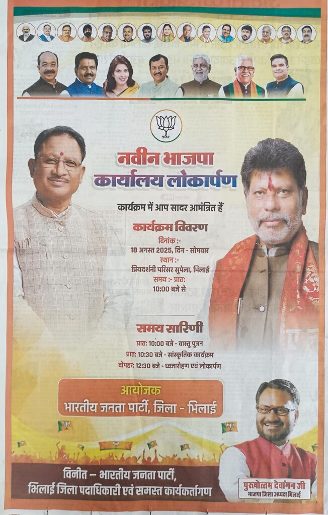 भिलाई 18 अगस्त (mohan media News) आज भाजपा जिला अध्यक्ष भिलाई के अध्यक्ष पुर पुरुषोतम देवांगनके नेतृत्व में नवीन भाजपा कार्यालय प्रियदर्शनी परिसर सुपेला भिलाई में प्रातः 10:00 बजे से लोकार्पण कार्यक्रम की शुरुआत हो जाएगी वास्तु पूजन10:30 बजे सांस्कृतिक कार्यक्रम और 12:30 बजे लोकाअर्पण कार्यक्रम का भव्य आयोजन की शुभारंभ होगा। कार्यक्रम में भाजपा जिला अध्यक्ष भिलाई के पुरुषोत्तम देवांगन एवं भारतीय जनता पार्टी भिलाई जिला पदाधिकारी व समस्त कार्यकताओं ने इस नवीन भाजपा कार्यालय के लोकार्पण में अधिक से अधिक संख्या में पधार करकार्यक्रम की शोभा बढ़ाने की आग्रह की गई है ।प्रियदर्शनी स्थिति इस कार्यालय में पहुंचने का जो मार्ग है यह सुपेला पुराना अंडर ब्रिज से यदि सेक्टर की ओर से आते है तोअंडर ब्रिज से निकलते ही पहला बाएं ओर की सड़क की ओर मुड़ेंगे तो थोड़ी दूर पर आपको बाएं तरफ भाजपा का विशाल कार्यालय देखने को मिलेगा कार्यक्रम स्थल में पहुंचने के लिए चूने क से मार्किंग की भी संभावना है ‘ ।