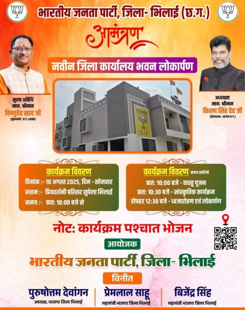 भिलाई (Mohan Media news)नवीन भाजपा कार्यालय प्रियदर्शनी परिसर सुपेला भिलाई का लोकार्पण कार्यक्रम के मुख्य अतिथि विष्णुदेव सांय के कर कमलो 18 अगस्त 2025 की दिन के 12.30 बजे संपन्न होगा । इस अवसर पर कार्यक्रम की अध्यक्षता करेंगे प्रदेश के भाजपा अध्यक्ष किरण सिंह देव जी ।इस कार्यक्रम को सफल बनाने के लिएभारतीय जनता पार्टी जिला भिलाई अध्यक्ष पुरुषोत्तम देवांगन व उनकी टीम ने सभी गणमान्य नागरिकों से अधिक अधिक की संख्या में उपस्थित होने की आग्रह की गई है ।