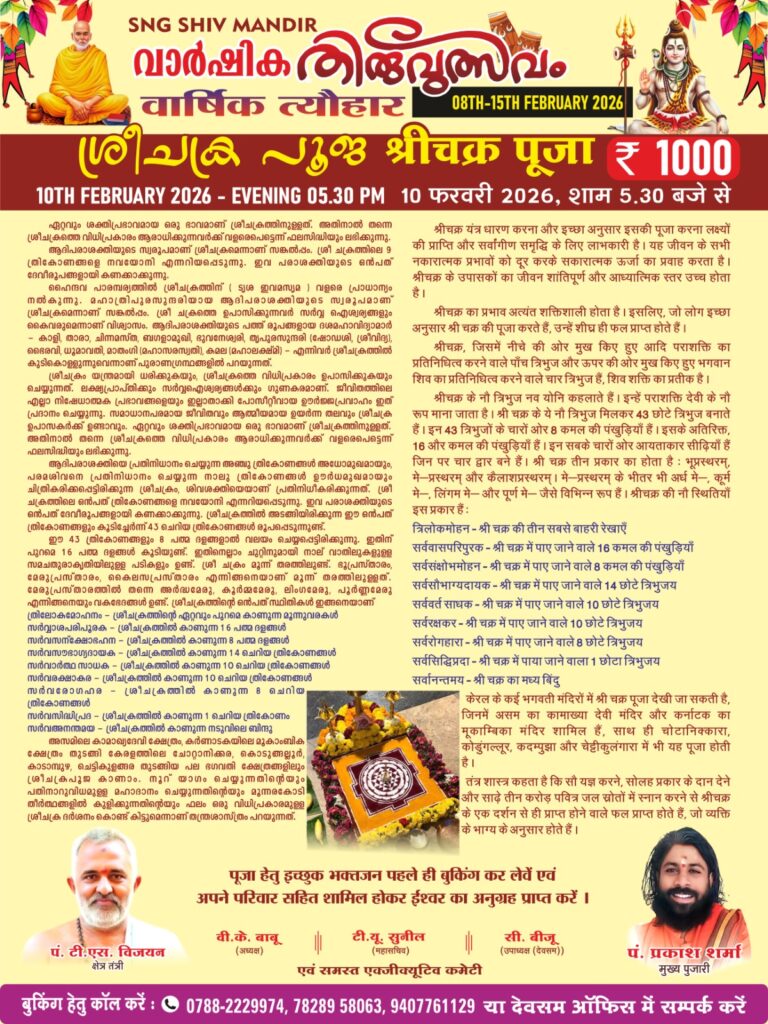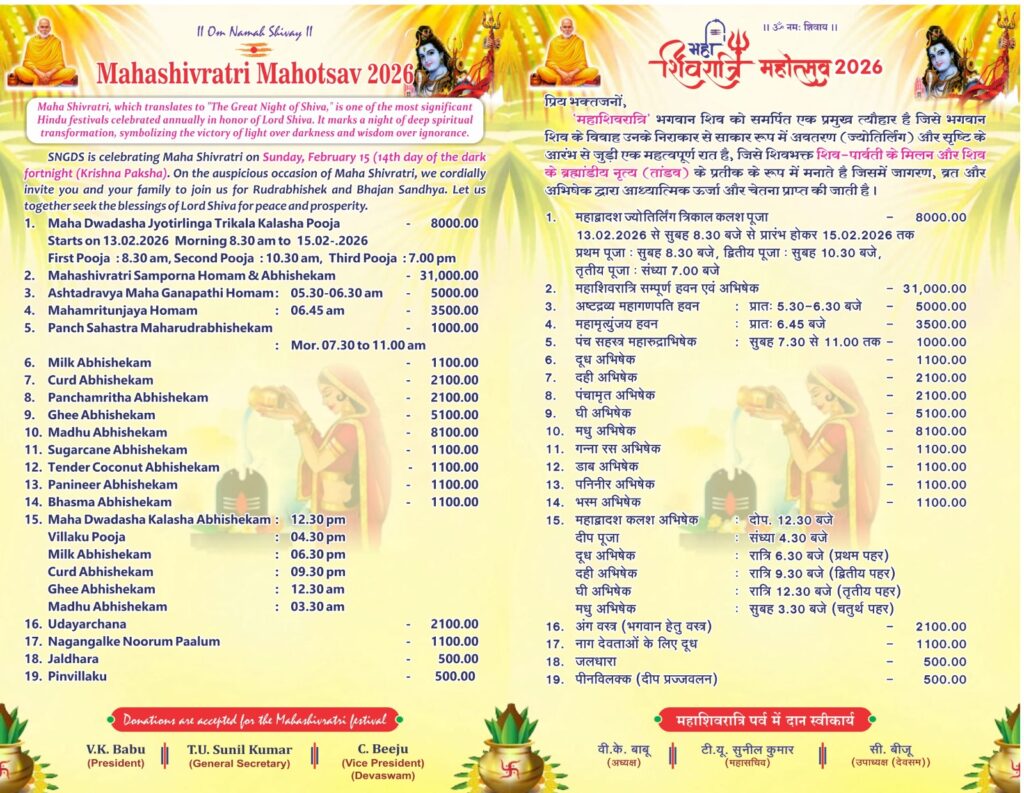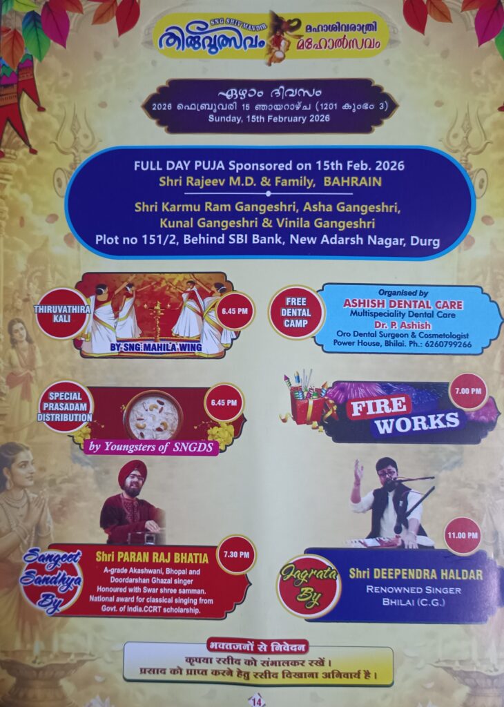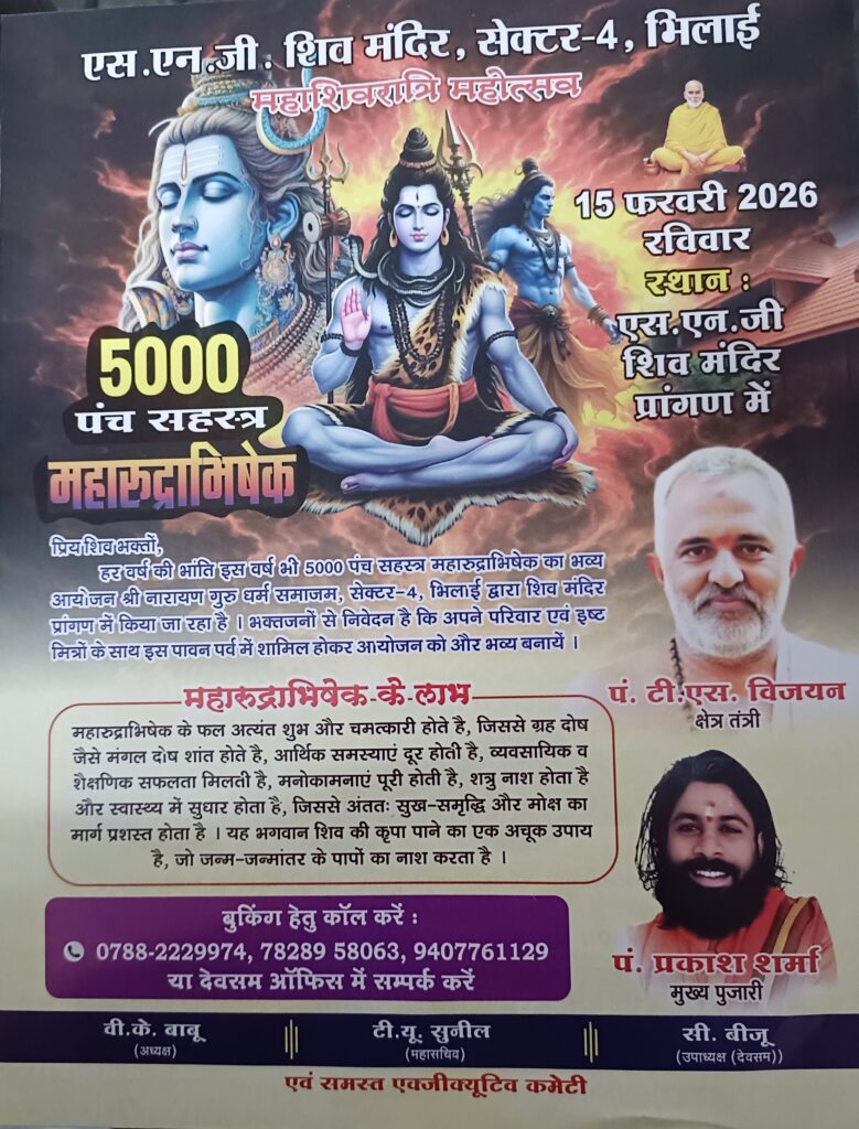 भिलाई । 6 फरवरी ( PMohan )श्रीनारायण गुरु धर्म समाज सेक्टर-4 के अध्यक्ष वी के बाबू ने जानकारी दी कि 9 से 15 फरवरी तक महाशिवरात्रि पर्व का आयोजन किया जा रहा है। प्रत्येक दिन विशेष पूजा-अर्चना के साथ प्रसाद का वितरण भी किया जाएगा। इस विशेष अवसर पर 8 फरवरी को सर्प बलि पूजा (नाग देवता पूजा) और 10 फरवरी को देवी पार्वती को समर्पित श्री चक्र पूजा का आयोजन किया जा रहा है। यह विशेष पूजा केरल से आए पंडितों और एसएनजी शिव मंदिर के पं. प्रकाश शर्मा, डॉ. एस विजयन द्वारा कराई जाएगी। महाशिवरात्रि महोत्सवके दिन गणपति हवन के साथ शिवजी का विशेष अभिषेक दूध, दही, घी, शहद, गन्ना रस व नारियल पानी से किया जाएगा। शाम को भजन और जगराता का आयोजन भी किया जा रहा है। भव्य आतिशबाजी विशेष आकर्षण का केंद्र होगी।