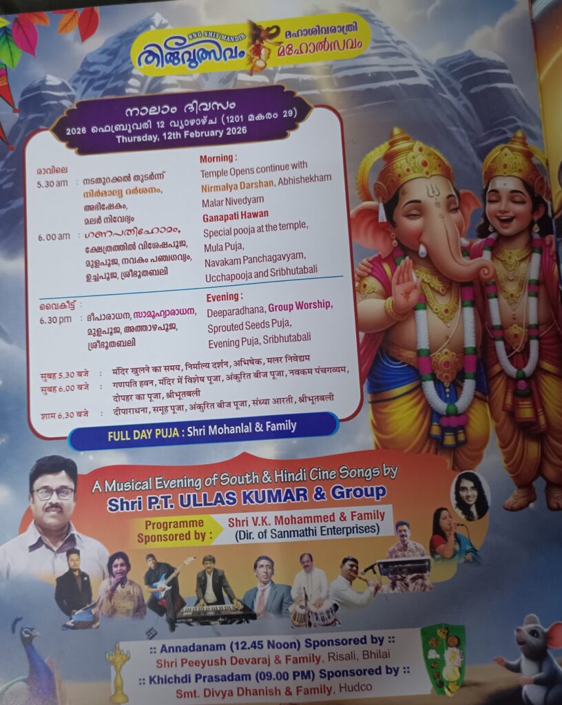 इस सात दिवसीय महोत्सव में शाम के समय सांस्कृतिक कार्यक्रम होंगे। आयुष और उनके बैंड टीम एवं आर्ट ऑफ लिविंग द्वारा भजनों की प्रस्तुति दी जाएगी। प्रसिद्ध गायक पीटी उल्लास द्वारा संगीत समारोह का आयोजन किया जाएगा। आराधना भक्ति ऑर्केस्ट्रा द्वारा और करोके द्वाराभजनों की प्रस्तुति दी जाएगी। परनराज भाटिया की संगीत संध्या और दीपेंद्र हलधर का जगराता भी होगा। समाज के महासचिव टी यू सुनील एवं देवसम बोर्ड के कोषाध्यक्ष पीएस सुरेश ने बताया कि श्री नारायण गुरु धर्म समाज में महाशिवरात्रि महोत्सव पर यह आयोजन नारायण गुरु के आदशों एवं उनके सिद्धांतों के अनुकरण के साथ होगा। इस महोत्सव में सभी धर्म एवं समाज के लोगों के साथ मिलकर प्रदेश की सुख शांति एवं समृद्धि के लिए पूजा आराधना की जाएगी। । पूरी तरह दक्षिणी भारतीय पद्धति से निर्मित यह शिव मंदिर के निर्माण केरल के कुशल कारीगरों द्वारा निर्मित किया गया ।इस मंदिर में श्रद्धालुओं की श्रद्धा बढ़ती ही जा रही है मंदिर परिसर मे प्रवेश करते ही एक अद्भुत शक्ति का प्रवाह होने की एहसास होता है ।शिवरात्रि के पावन पर्व पर इस शिव मंदिर मेंअपनी तैयारी चरम पर है।