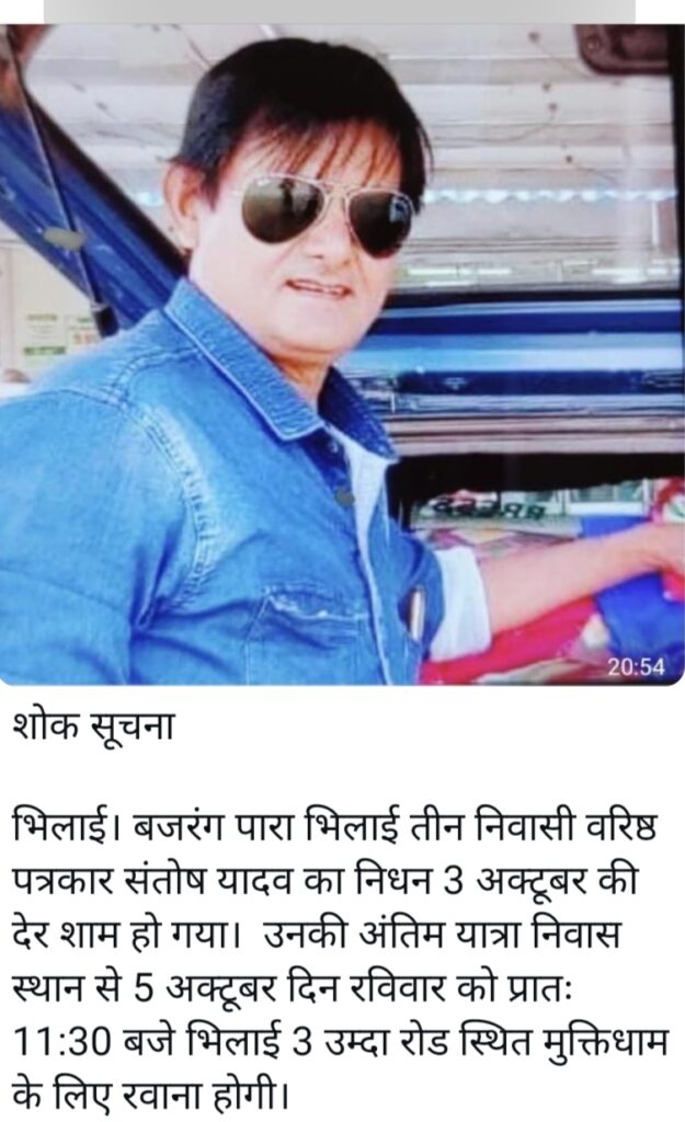 Blog वरिष्ठ पत्रकार संतोष यादव की आज अंतिम संस्कार भिलाई 3 में p mohanOctober 5, 2025 No Comments Spread the love