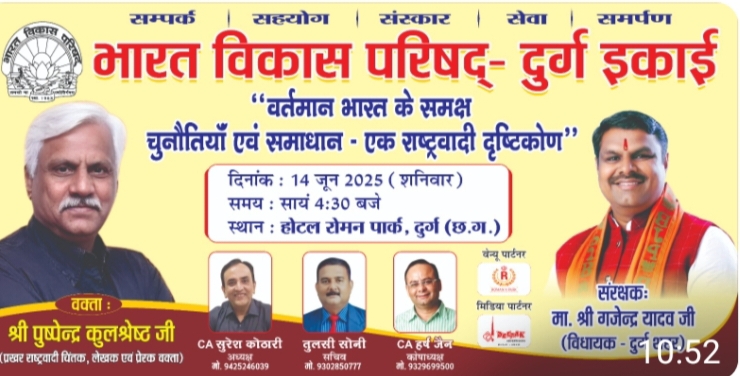 14 जून शनिवार (mohan media NEWS)एक विशेष राष्ट्र चिंतन व्याख्यान का आयोजन दुर्ग में किया जा रहा है ।इसके वक्ता होंगे देश की प्रख्यात राष्ट्रवादी चिंतक प्रभावशाली वक्ता लेखक तथा मीडिया विश्लेषण श्री पुष्पेंद्र कुलश्रेष्ठ जो वर्तमान भारत के समक्ष चुनौतियां एवं समाधान एक राष्ट्रवादी दृष्टिकोण विषय पर अपने विचार प्रस्तुत करेंगे । उक्त जानकारी आज एक प्रेस वार्ता के माध्यम से भारत विकास परिषद दुर्ग शाखा के अध्यक्ष सुरेश कोठारी, सचिव तुलसी सोनी, कोषाध्यक्ष हर्ष जैन, व मीडिया प्रभारीश्रीमती लक्ष्मी वर्मा ने संयुक्त रूप से दी ।उन्होंने वार्ता में कहा की पुष्पेंद्र जी का यह केवल एक व्याख्यान नहीं बल्कि एक वैचारिक यात्रा है ।आज भारत एक निर्णायक दौर से गुजर रहा है, एक और वैश्विक मंच पर भारत की प्रतिष्ठा और भूमिका में अभूतपुरवृध्दि हो रही है, वहीं दूसरी ओर देश के सामने आंतरिक सामाजिक वैचारिक और सांस्कृतिक चुनौतियां भी उतनी ही गंभीर है । विचारों का दुव्रीकरण सामाजिक विद्धेश मूल्यहीनता और राष्ट्र हित की प्राथमिकता से विचलित होती सोच यह सब आधुनिक भारत के समक्ष गंभीर प्रश्न बनकर उभरे हैं ।इन्हीं प्रश्नों पर एक संतुलित तथ्य पूर्ण राष्ट्रीय हित आधारित विमर्श के उद्देश्य से भारत विकास परिषद दुर्ग इकाई द्वारा व्याख्यान आयोजित कर रही है । इसका उद्देश्य केवल जानकारी देना नहीं बल्कि नवयुवकों को सामाजिक कार्यकर्ताओं, शिक्षकों, व बुद्धिजीवियों और नीति निर्माता के बीच एक सक्रिय संवाद की शुरुआत करना है । जो भारत के भविष्य की दिशा तय करने में सहायक हो सके ।श्री पुष्पेंद्र कुलश्रेष्ठ जी देश की उन चुनिंदा प्रभावशाली वक्ताओं में से एक विशेष स्थान रखने वाला वक्ता है ।जो राष्ट्रवाद सांस्कृतिक चेतना इतिहास और समकालीन राजनीति पर विचार, वैचारिक स्पष्टता के साथ संवाद की परंपरा को जन-जन तक पहुंचा रहा है। उन्होंने देश-विदेश के अनेक मंचो से भारत की अस्मिता, गौरव, और सुरक्षा, से जुड़े मुद्दों को मुखरता से प्रस्तुत किया है ।श्री कुलश्रेष्ठजी ने बीबीसी लंदन, सहारा समय ,ज़ी न्यूज़, जैसे प्रतिष्ठित मीडिया संस्थानों में वरिष्ठ पत्रकार के रूप में कार्य किया है. अभी पूर्ण रूप से सामाजिक और वैचारिक जागरण को समर्पित है. उनके व्याख्यान युवा वर्ग में विशेष रूप से लोकप्रिय है । क्योंकि यह ऐतिहासिक समसामयिक संदर्भ और विचारों को अत्यंत सहज लेकिन प्रभावी ढंग से प्रस्तुत करते हैं । भारत विकास परिषद जो कि एक स्वयंसेवी संगठन है । ने सभी नागरिक को विशेष कर युवाओं से निवेदन किया हैं कि युवाओं में जोश भरने वाली इस प्रभावशाली वक्ता पुष्पेंद्र कुलश्रेष्ठ के इस कार्यक्रम में सहभागी बने और एक विचार सिर्फ मजबूत और आत्मकथा