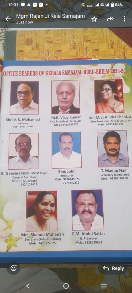 भिलाई ।केरला समाजम दुर्ग भिलाई का चुनाव 20 जुलाई 2025 को सेक्टर 5 स्थित कार्यालय में संपन्न हुआ ।इस बार पुरानी कार्यकारिणी को ही तीसरी बार के लिये मनोनीत किया गया ।सर्वसम्मति से पारित इस नई कार्यकारिणी में बी के मोहम्मद को अध्यक्ष पद पर ,विजय कुमार को उपाध्यक्ष, G वर्गीस महासचिव ,डॉक्टर अनीता शंकर उपाध्यक्ष आर्ट एंड कल्चरल, बीनू जॉन को कोषाध्यक्ष ,मधु नायर को सचिव समाजम, श्रीमती शानू मोहन सचिव आर्ट एंड कल्चरर, C M अब्दुल सत्तार को संयुक्त कोषाध्यक्ष ,के रूप में नई कार्यकारिणी का गठन किया गया । इस अवसर समाज के सदस्यों ने नई कार्यकारिणी को बधाई देते हुए समाज के अध्यक्ष वी के मोहम्मद के नेतृत्व में समाज के हित के लिए अच्छे-अच्छे कार्य करने के प्रति उम्मीद जताई गई है।बीके मोहम्मद एक सामाजिक कार्यकर्ता के रूप में जाने जाते हैं उनके कार्य क्षेत्र भी काफी विस्तार में है। समाज के सहस्यो ने Vk मोहम्मद के नेतृत्व में समाज के हित में और भी अच्छे-अच्छे कार्यो को अंजाम देते हुए केरला समाजम की पहचान को और निखारने की उम्मीद जताई है ।