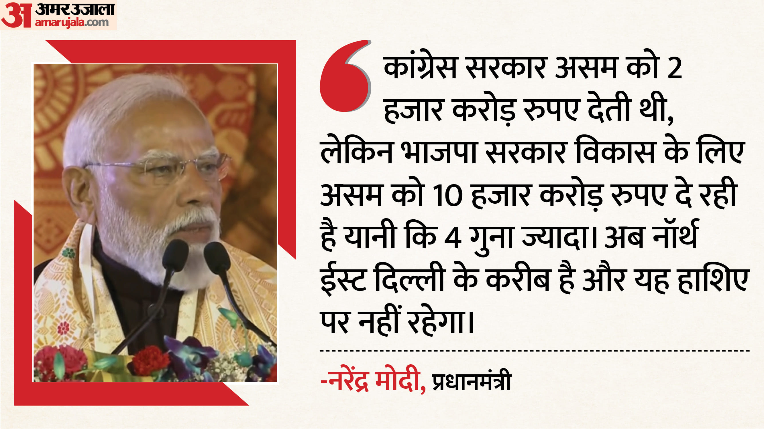 - ‘दशकों तक यहां के लोगों को महसूस होता रहा कि देश का विकास कहीं और हो रहा है और वे पीछे छूट रहे हैं। इस भावना को बदलने का का काम हमने किया। नॉर्थ इंडिया के विकास के अपनी प्राथमिकता बनाया। नॉर्थ ईस्ट के रेल कनेक्टिविटी बहुत महत्वपूर्ण थी, लेकिन कांग्रेस सरकार ने इस पर कभी ध्यान नहीं दिया। हमने यहां रेल कनेक्टिविटी को बढ़ाया।’